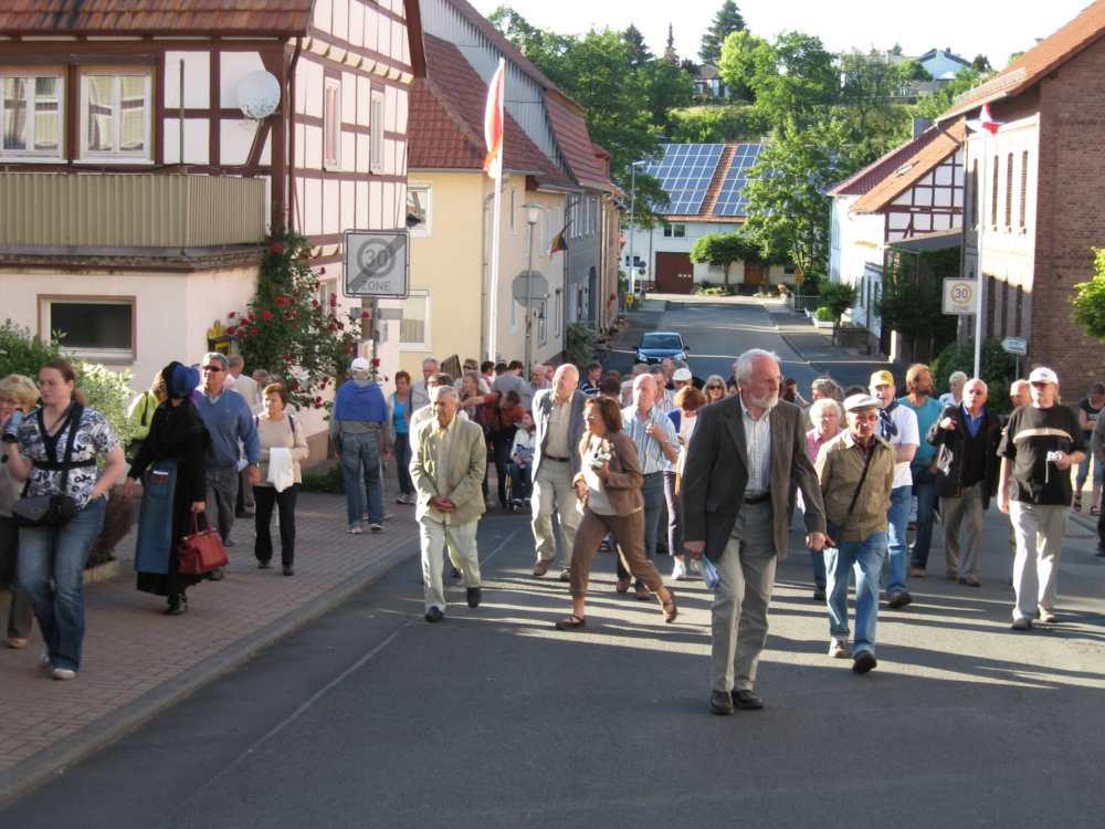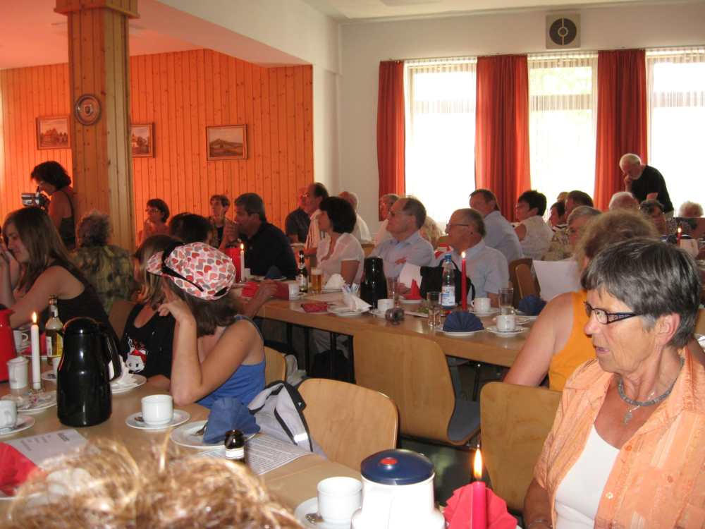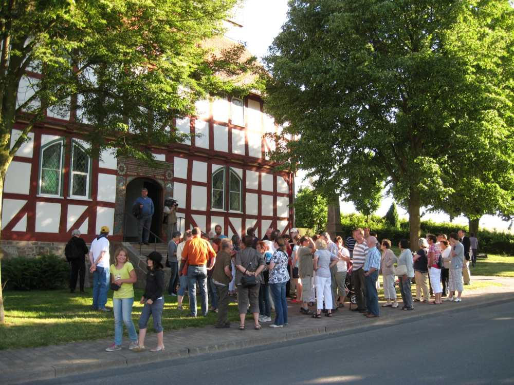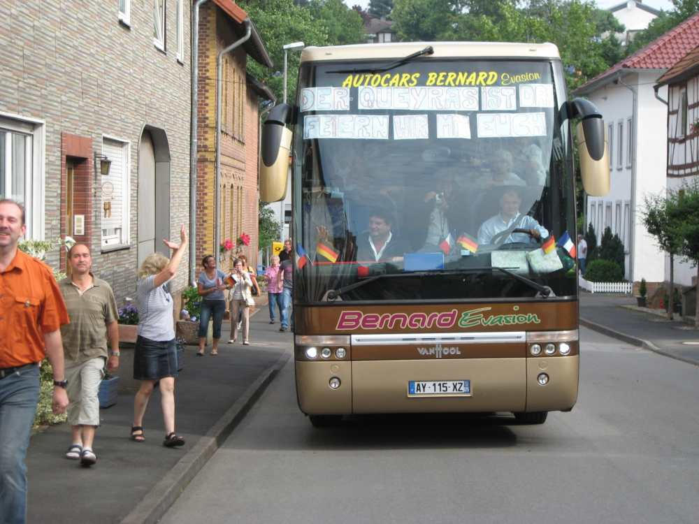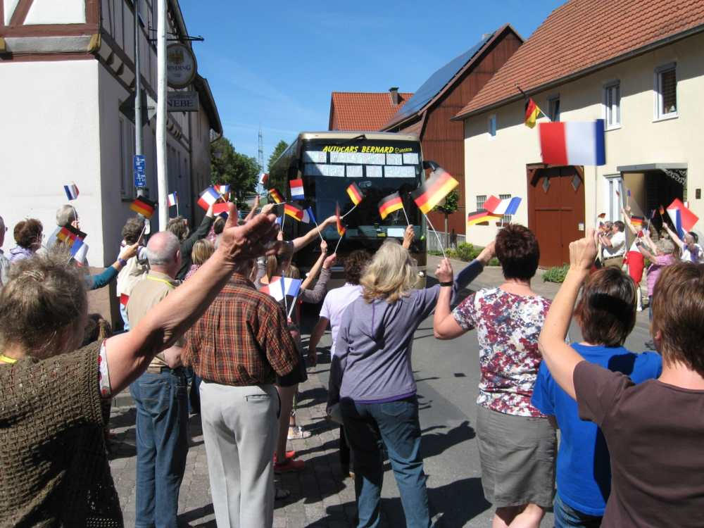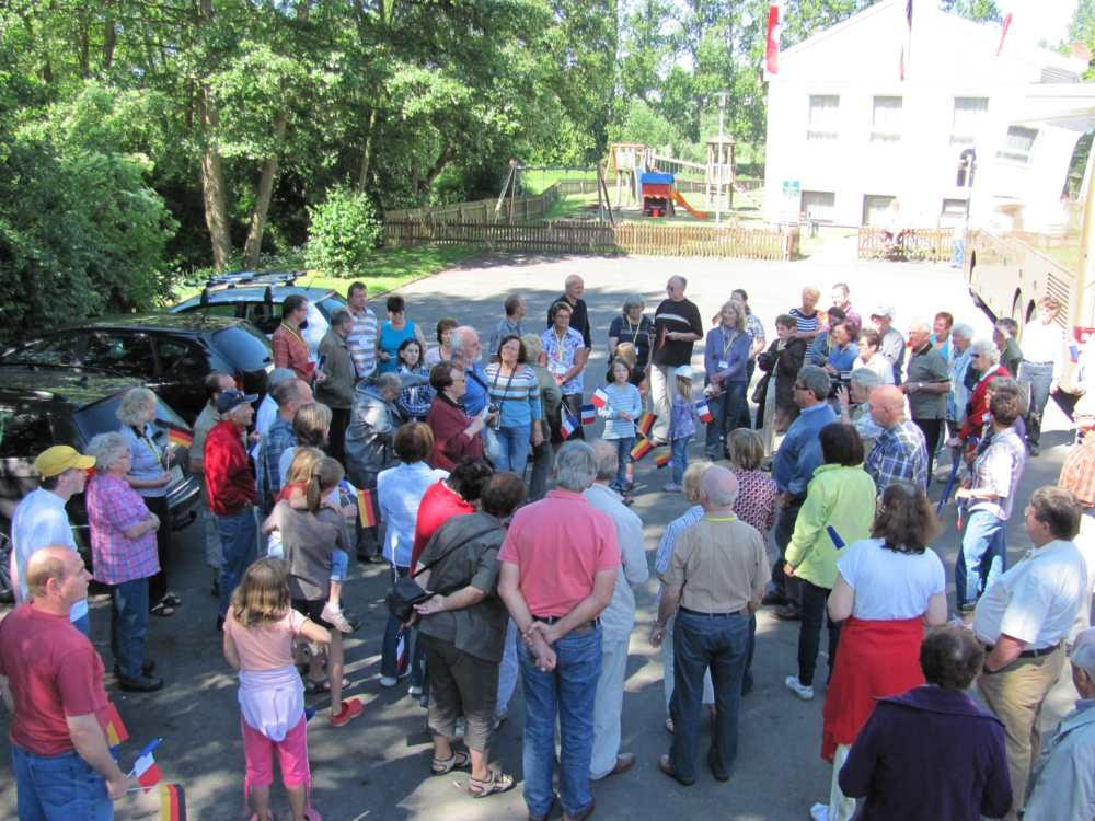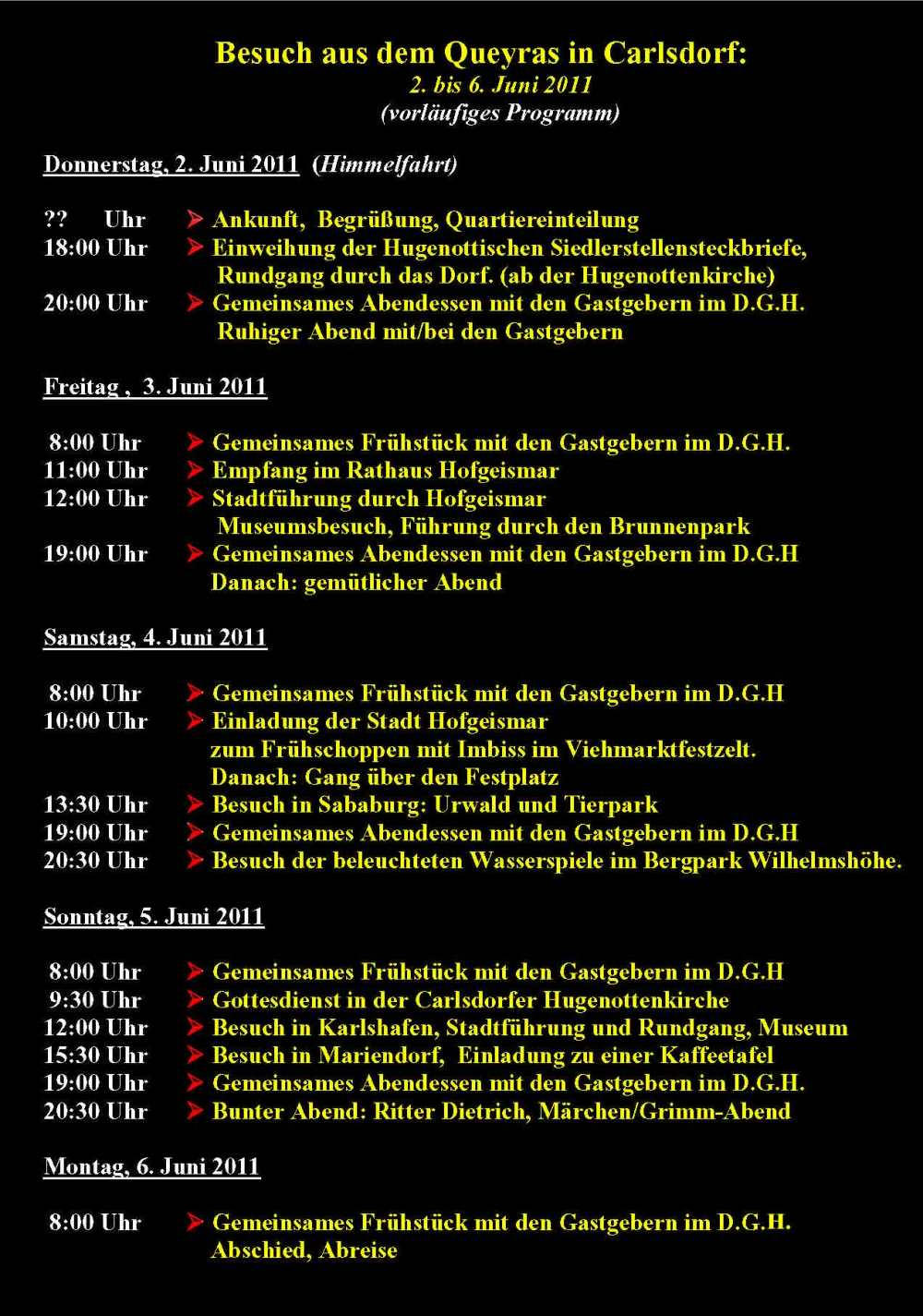 Besuch aus dem Queyras in Carlsdorf2. bis 6. Juni 2011Während des Besuches einer großen Gruppe aus Carlsdorf im Queyras (Frankreich) im Mai 2010, wurde die Einladung zu einem Gegenbesuch nach Carlsdorf überreicht. Seitdem lief die Planung in Carlsdorf und auch in Frankreich auf vollen Touren. Der Termin für den Besuch der Queyrassiner ließ sich leider nicht mit der Carlsdorfer 325-Jahr-Feier koordinieren. Somit fand der Besuch vom 2. bis 6. Juni 2011 statt. Das Besuchsprogramm:Endlich war es so weit. Nach wochenlanger Vorarbeit kamen die Queyrasiner in Carlsdorf an. Sie wurden von vielen Carlsdorfern herzlich empfangen. Die Kinder hatten Fähnchen und winkten eifrig. Es war gelungen alle Gäste bei Carlsdorfer Familien unterzubringen.HIERFÜR DANKE AN ALLE!Nach einer kurzen Begrüßung bei Sekt, Kaffee und Kuchen ging man zu den Gastfamilien. Um 18 Uhr trafen sich alle zur Einweihung der hugenottischen Siedlerstellen - Steckbriefe. Danach kam man , wie an jedem Abend, im Dorfgemeinschaftshaus zum gemeinsamen Essen zusammen, wohin auch die Gastfamilien und alle Carlsdorfer eingeladen waren. Genauso war es morgens beim Frühstück. Dies war eine gute Basis für das persönliche Kennenlernen wobei die Sprache keine Probleme verursachte. Die Tage waren ausgefüllt mit Fahrten, Besuchen und Einladungen: Z. B. Führungen in Bad Karlshafen, Hofgeismar und ein Besuch in Mariendorf. Der Geschichtskreis Mariendorf hatte zu Kaffee und Kuchen eingeladen. Die Queyrasiner waren begeistert von dem großen Kuchenangebot. Man war in Sababurger Tierpark und im Park Wilhelmshöhe bei den Wasserspielen. Die Stadt Hofgeismar hatte am Samstag den 4.Juni zum Frühschoppen mit Imbiss in das Festzelt vom zeitgleich stattfindenden Viehmarkt eingeladen. So vergingen die Tage wie im Flug und der 6.Juni, der Abreisetag, war gekommen. Man musste Abschied nehmen. Ein letztes gemeinsames Frühstück und viele Wünsche für eine gute Heimfahrt machten den Abschied nicht leichter. Es wurde wieder kräftig gewunken. Mit lautem Gehupe verabschiedeten sich die Queyrasiner.